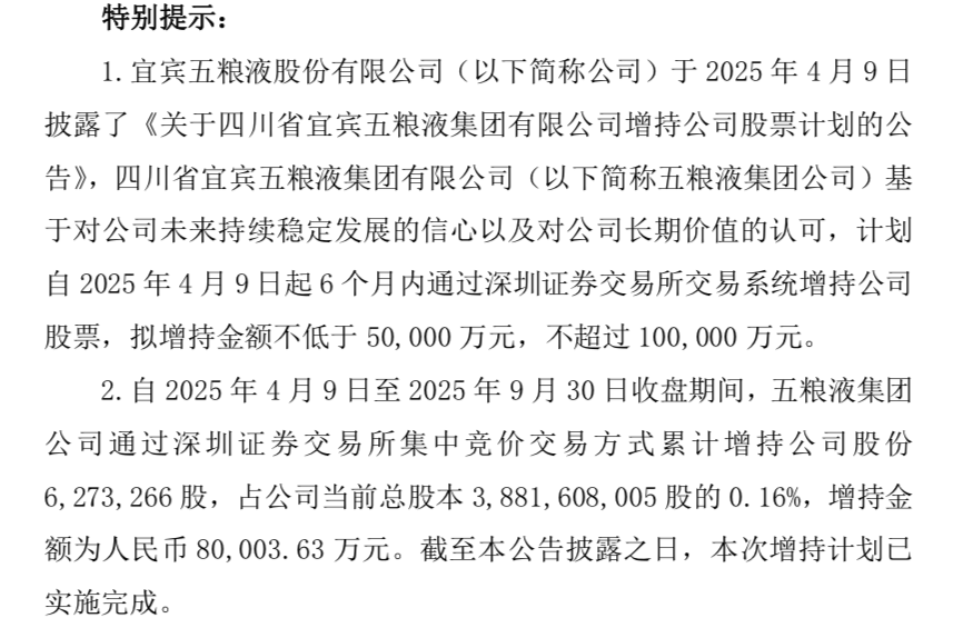 10月10日晚间,五粮液(000858.SZ)发布增持计划实施结果:自2025年4月9日至2025年9月30日收盘期间,公司控股股东五粮液集团通过深圳证券交易所集中竞价交易方式累计增持公司股份627.33万股,占据总股本的比例为0.16%,增持金额约8亿元。