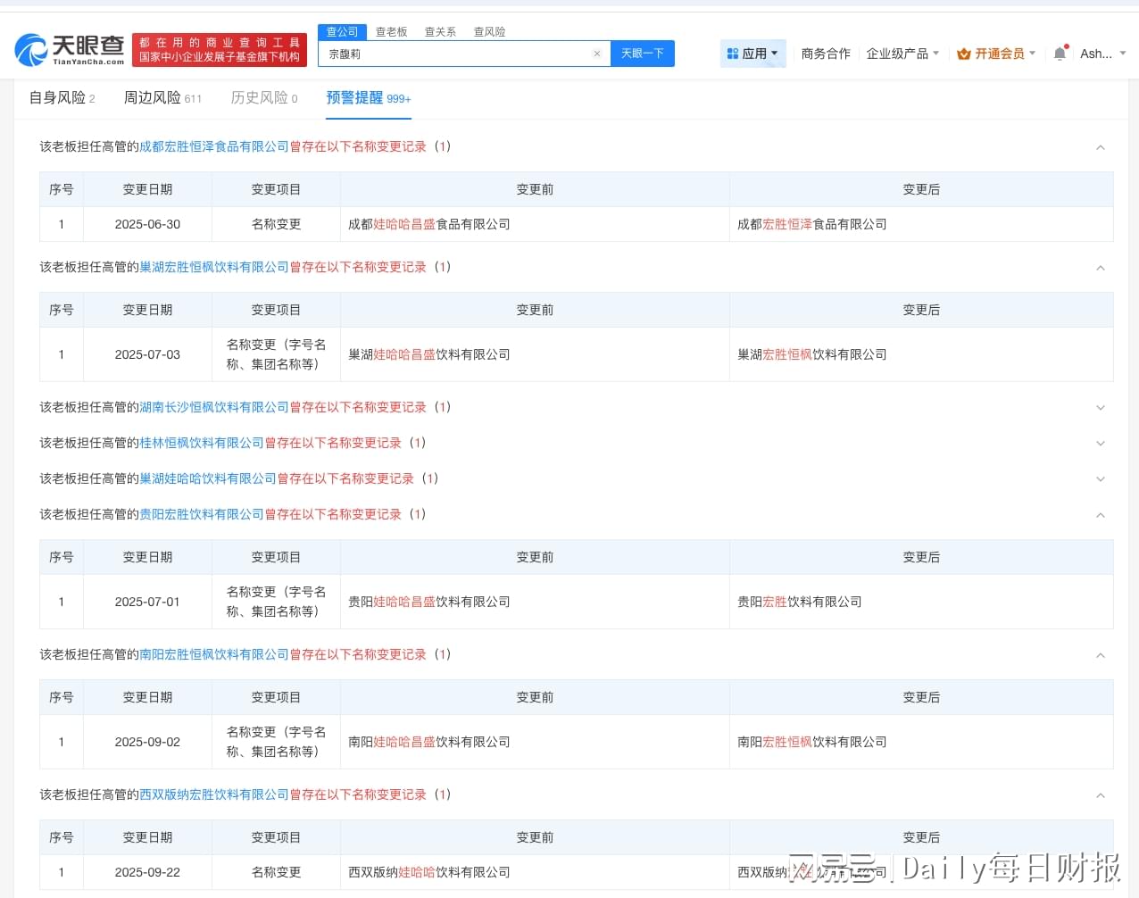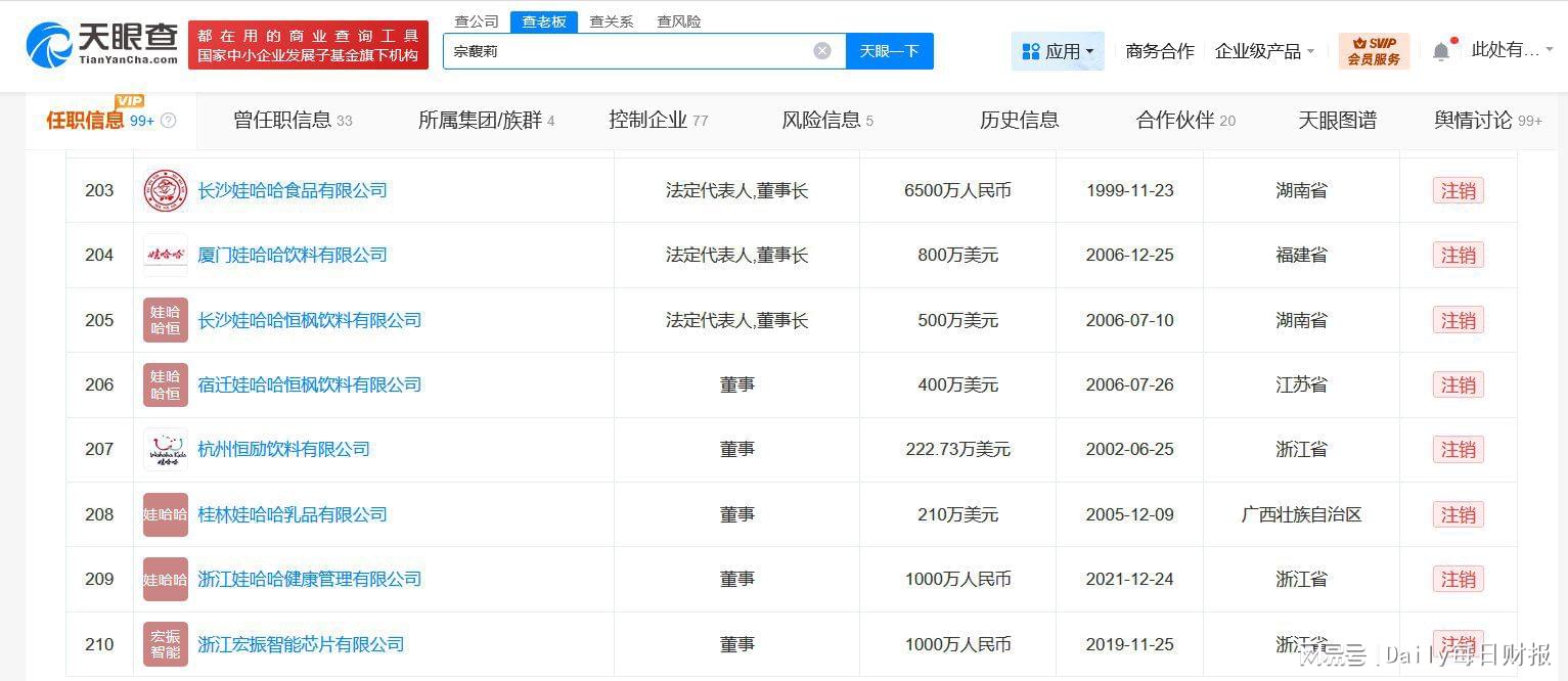 宏胜饮料集团有限公司在2025年2月至5月申请注册了几十个“娃小宗”的商标。预示着宗馥莉已经为脱离娃哈哈独自创业做好了准备。