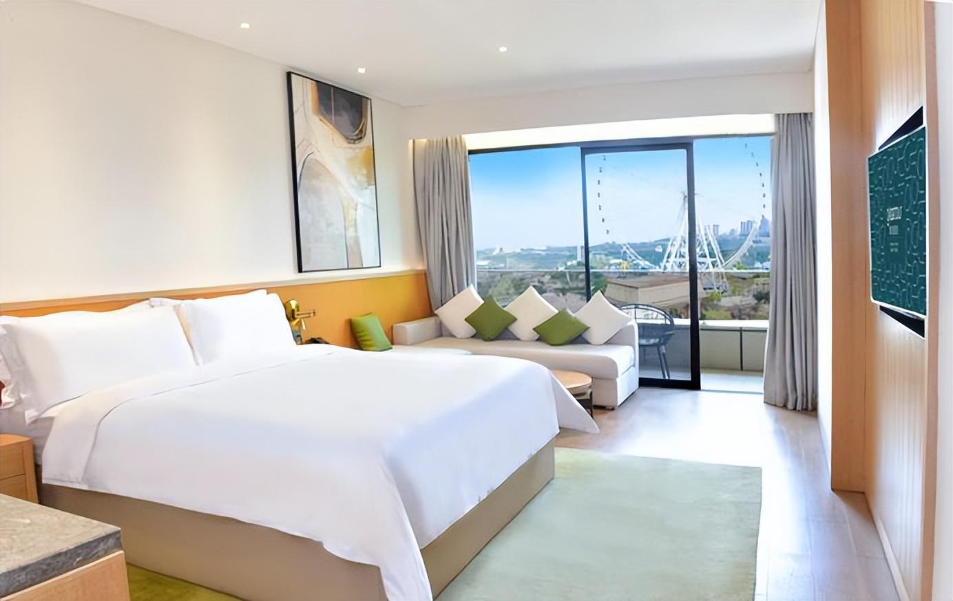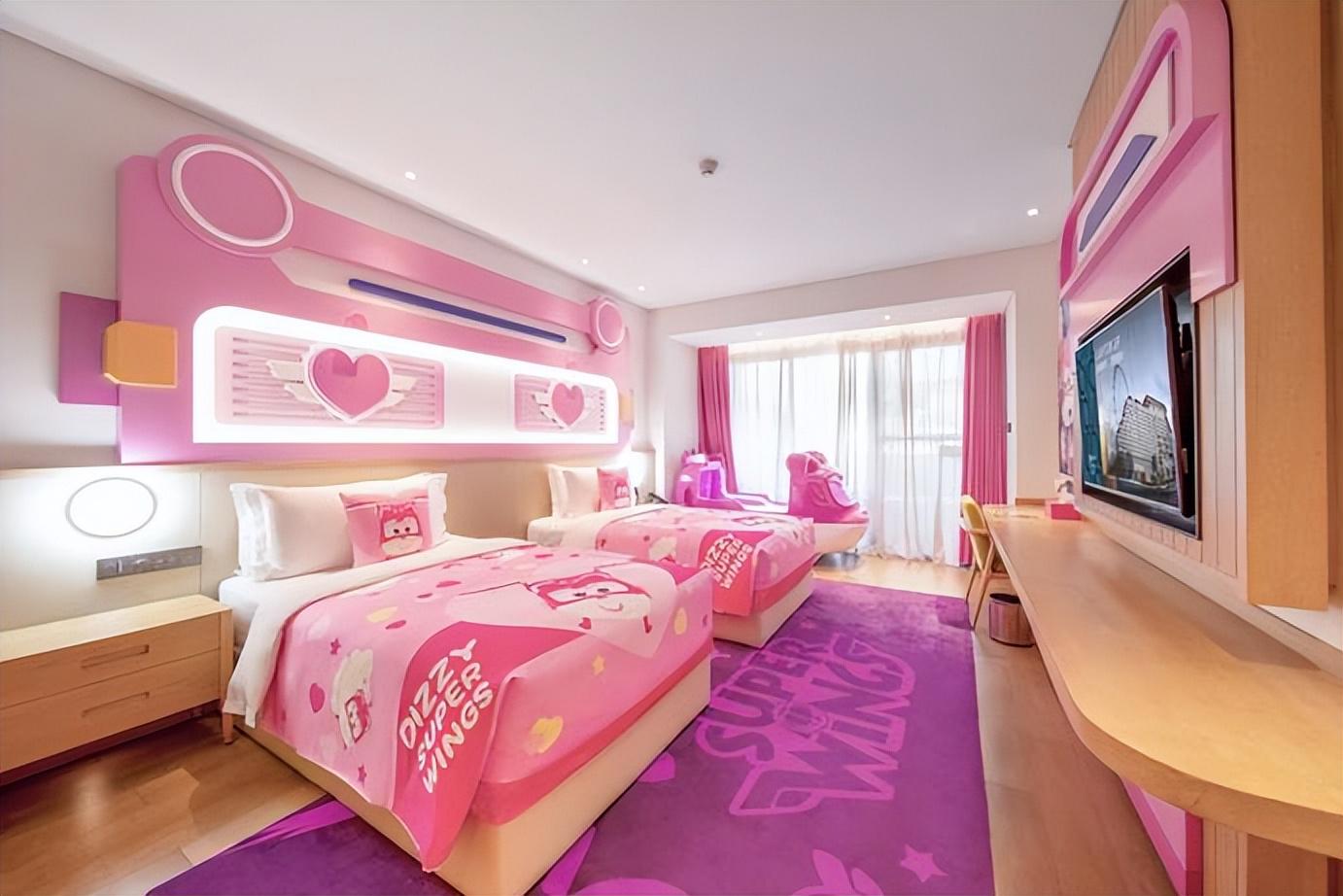 设计上,酒店将“乐园氛围”与“温馨质感”巧妙融合。外立面以欢乐谷巨型摩天轮为背景,简约大气;室内以浅绿色、原木色、米白色为主色调,借助山城自然光延伸至空间内,营造出舒适通透的氛围。163间客房及套房延续摩登设计,宽敞空间保障休憩品质,推窗可见乐园内缤纷运转的游乐设施,墙面艺术化摩天轮图案更添趣味。尤其为家庭客群打造的超级飞侠主题房,正版IP元素点缀其间,为孩子构筑梦幻空间,真正实现“零距离游园,高品质亲子时光”。
