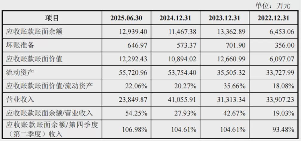 2022年、2023年、2024年、2025年1-6月各期末,公司应收账款账面余额分别为6,453.06万元、13,362.89万元、11,467.38万元、12,939.40万元,占营业收入的比例分别为19.03%、42.67%、27.93%、54.25%。其中,2023年末,公司应收账款账面余额较上年末增长107.08%。