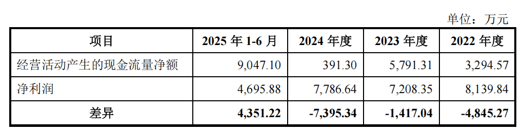 同期,公司经营活动产生的现金流量净额与当期净利润差异分别为-4,845.27万元、-1,417.04万元、-7,395.34万元、4,351.22万元。
