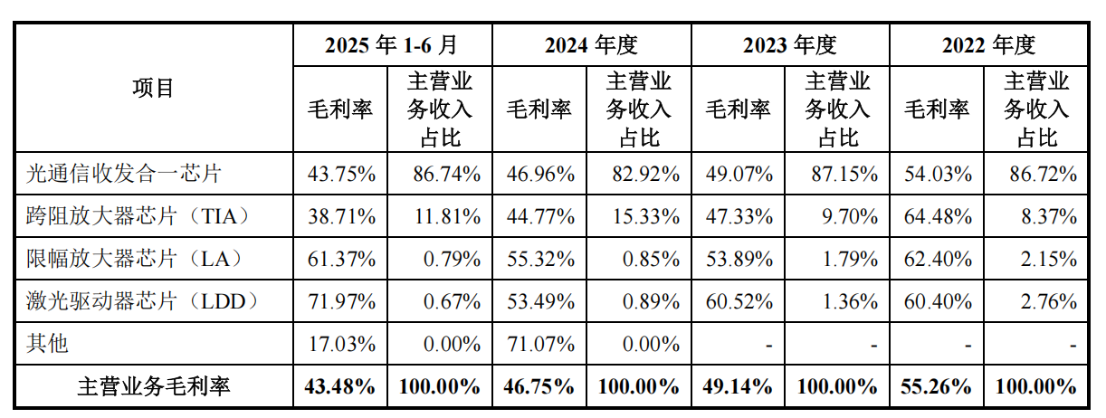 在此背景下,优迅股份主营业务毛利率持续走低,从2022年55.26%一路下滑至2025年上半年43.48%,累计下跌近12个百分点。