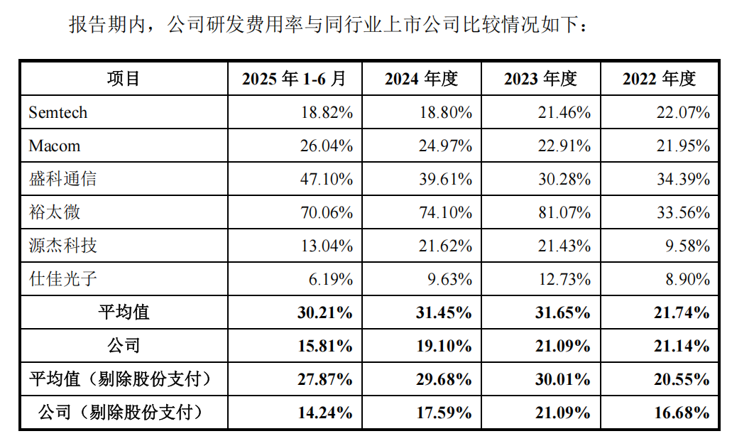 近年来,优迅股份研发费用率逐年下滑。2022年、2023年、2024年、2025年1-6月,分别为21.14%、21.09%、19.10%、15.81%,同行业可比公司的均值分别为21.74%、31.65%、31.45%、30.21%。
