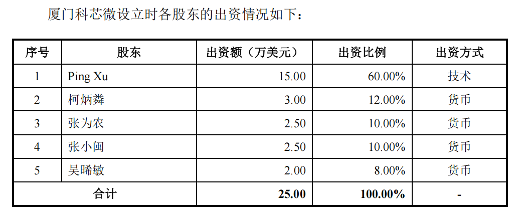 2003年,Ping Xu与柯炳粦、吴晞敏等人共同创立了公司前身厦门科芯微,到2013年,实控人均为Ping Xu。