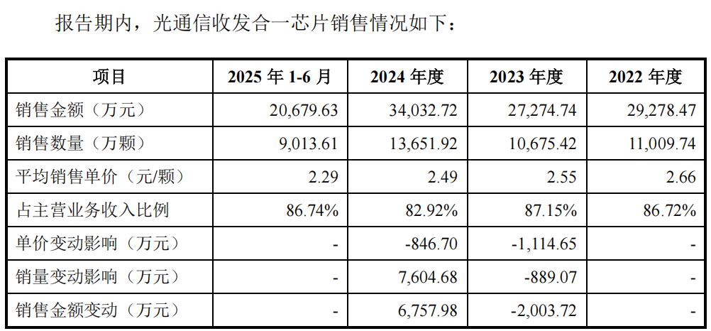 受行业波动、客户需求变动,以及部分产品价格竞争日益激烈等因素影响,光通信收发合一芯片平均售价呈现逐年下降趋势。2022年、2023年、2024年、2025年1-6月,分别为2.66元/颗、2.55元/颗、2.49元/颗、2.29元/颗。