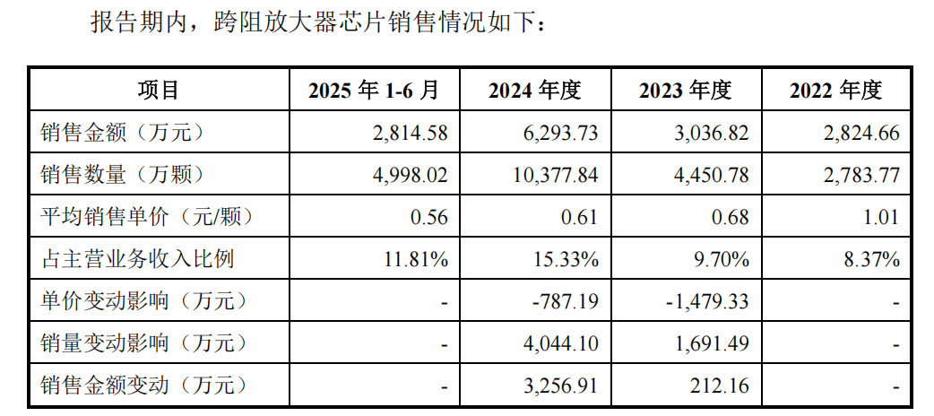 2022年、2023年、2024年、2025年1-6月,跨阻放大器芯片收入分别为2,824.66万元、3,036.82万元、6,293.73万元、2,814.58万元,占主营业务收入的比例分别为8.37%、9.70%、15.33%、11.81%,是公司第二大收入来源。