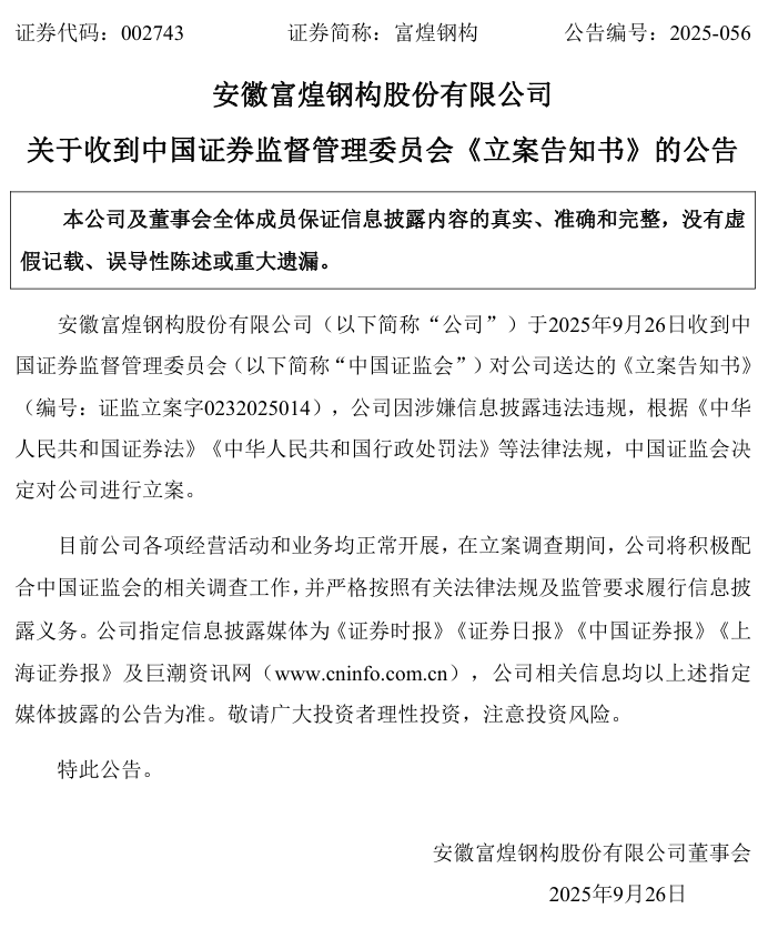 2025年9月27日,富煌钢构发布公告称,因涉嫌信息披露违法违规,收到中国证监会《立案告知书》。