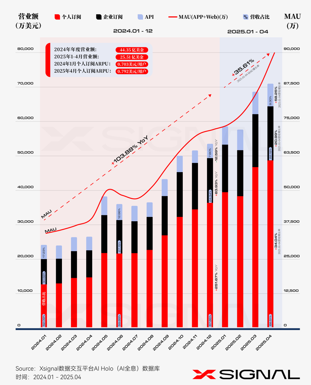 梳理过往ChatGPT的用户量增长情况来看,Xsignal AI Holo(AI全息)数据库数据显示,自2022年11月发布到2023年12月,ChatGPT的MAU突破2亿,在2024年度,MAU继续从3.2亿激增至6.5亿,年度增长率高达103.88%,在今年第一季度,ChatGPT实现了35.61%的显著增长,MAU接近9亿。
