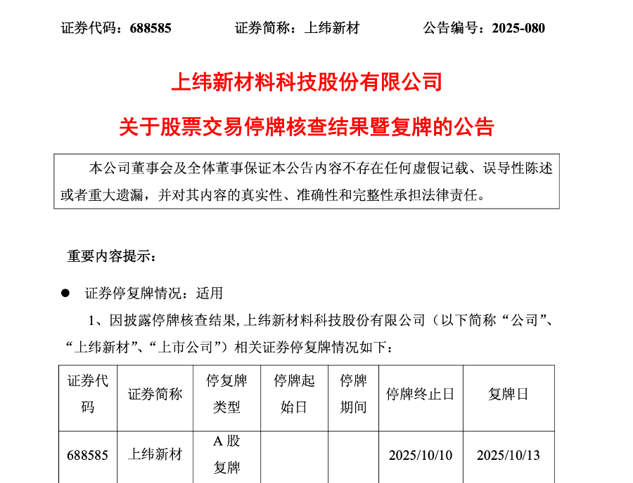 20倍大牛股上纬新材,昨日(10月10日)晚间公告停牌核查结果,宣布拟下周一(10月13日)复牌。