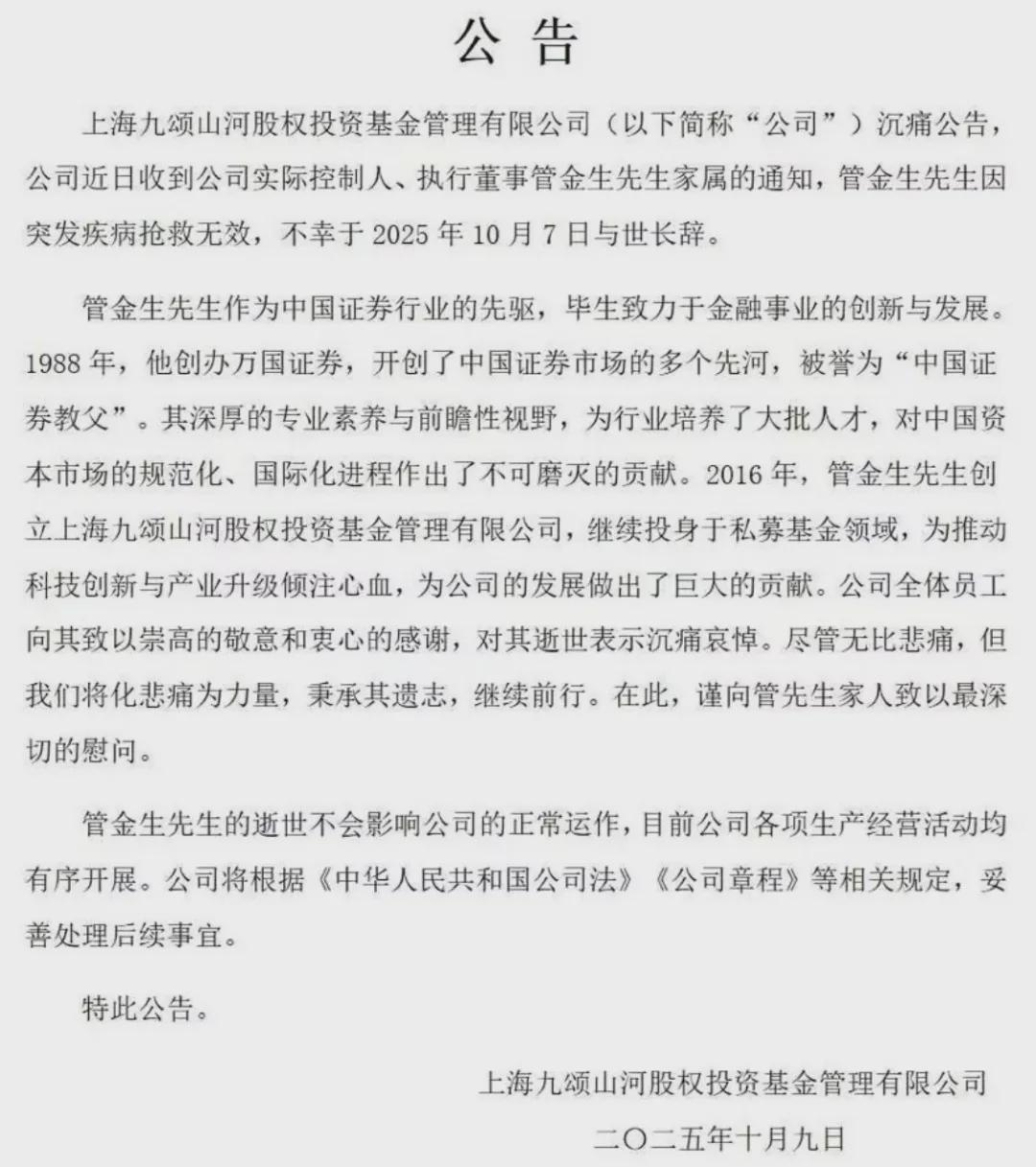 10月9日深夜,上海九颂山河股权投资基金管理有限公司通过微信公众号发布公告,公司实际控制人、执行董事管金生因突发疾病抢救无效,不幸于2025年10月7日与世长辞。