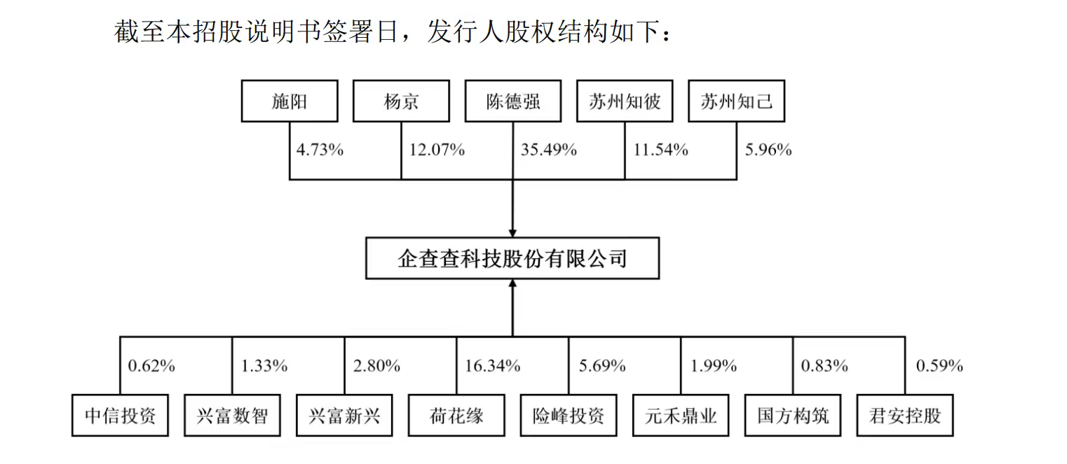 陈德强也是企查查的控股股东、实际控制人。根据招股书披露,其直接持有公司35.49%的股份,通过苏州知彼间接控制公司11.54%的股份,通过苏州知己间接控制公司5.96%的股份,合计控制公司53%的股份。