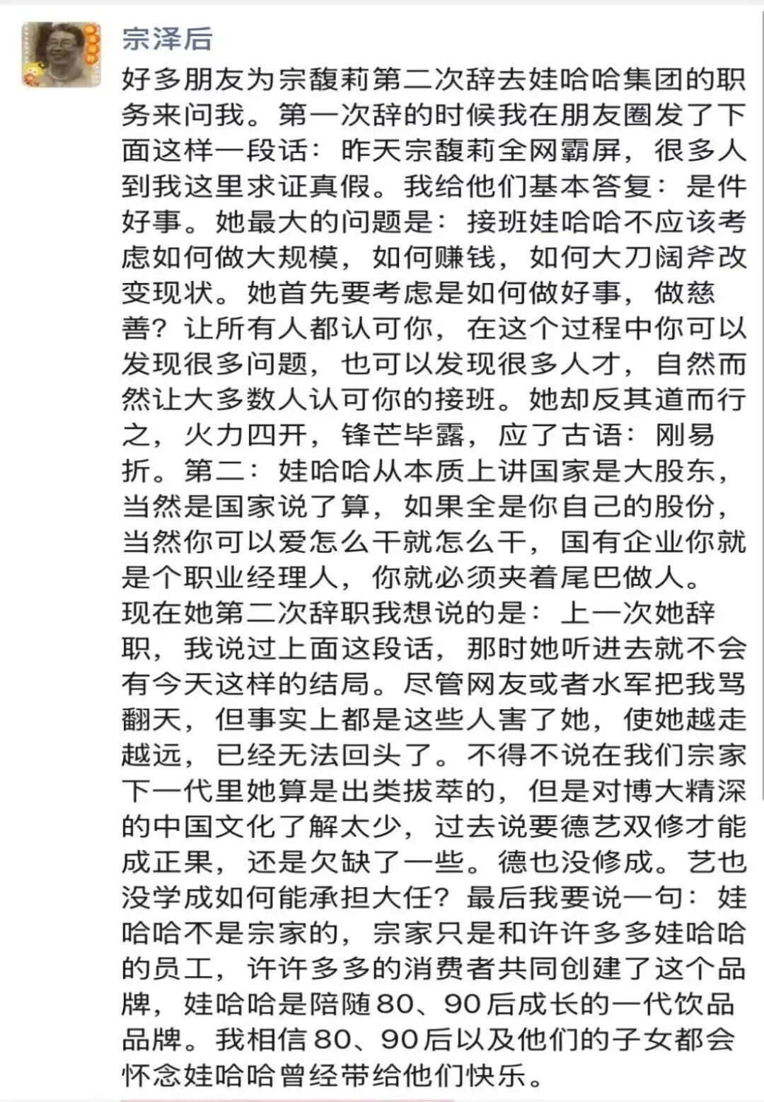 宗泽后还写道:“不得不说在我们宗家下一代里她算是出类拔萃的,但是对博大精深的中国文化了解太少,过去说要德艺双修才能成正果,还是欠缺了一些。德也没修成。艺也没学成如何能承担大任?最后我要说一句:娃哈哈不是宗家的,宗家只是和许许多多娃哈哈的员工,许许多多的消费者共同创建了这个品牌,娃哈哈是陪随80、90后成长的一代饮品品牌。我相信80、90后以及他们的子女都会怀念娃哈哈曾经带给他们快乐。”