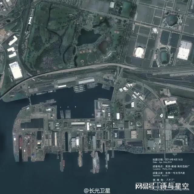 吉林一号是长光卫星的产品,2016年,长光卫星官微发过一张照片,是美国费城海军造船厂的状况,里面的航母和军舰非常清晰。