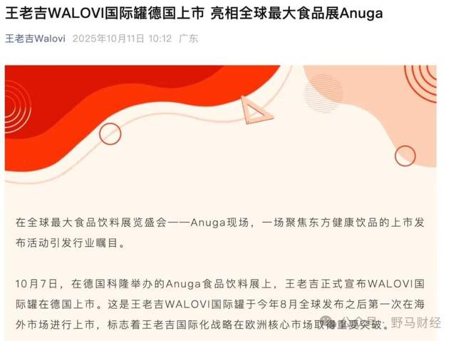 10月11日,王老吉Walovi微信公众号发布新闻称,王老吉WALOVI国际罐德国上市,亮相全球最大食品展Anuga。而就在前几天,王老吉与加多宝因为海外商标使用权,正隔空打得火热。