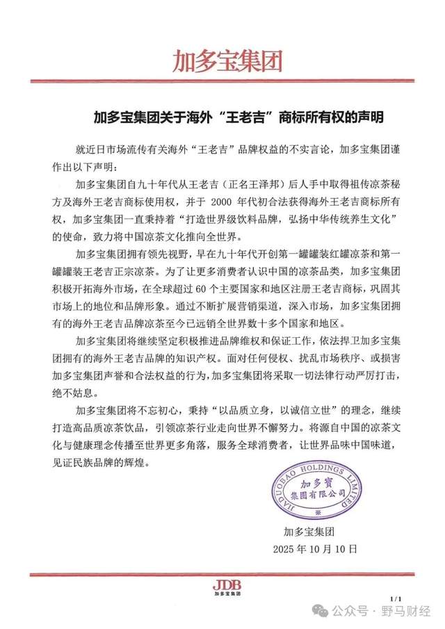 10月10日,加多宝集团发布声明,强调自上世纪90年代从王老吉后人处取得凉茶秘方及海外商标使用权,并于2000年代初完成全球60余国商标注册,宣称“坚决捍卫海外知识产权”。当晚,王老吉大健康公司仅用12字回应:“有病去医院,有事找法院。”