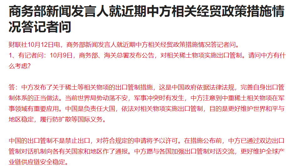 商务部对稀土和特朗普关税做出回应,商务部表示中国的出口管制不是禁止出口,对符合规定的申请将予以许可。在措施公布前,中方已通过双边出口管制对话机制向各有关国家和地区作了通报。中方愿与各国加强出口管制对话交流,更好维护全球产业链供应链安全稳定。