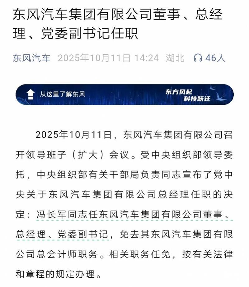 10月11日,东风汽车公众号发布消息称,东风汽车集团有限公司召开领导班子(扩大)会议,宣布了党中央关于东风汽车集团有限公司总经理任职的决定:冯长军任东风汽车集团有限公司董事、总经理、党委副书记,免去其东风汽车集团有限公司总会计师职务。