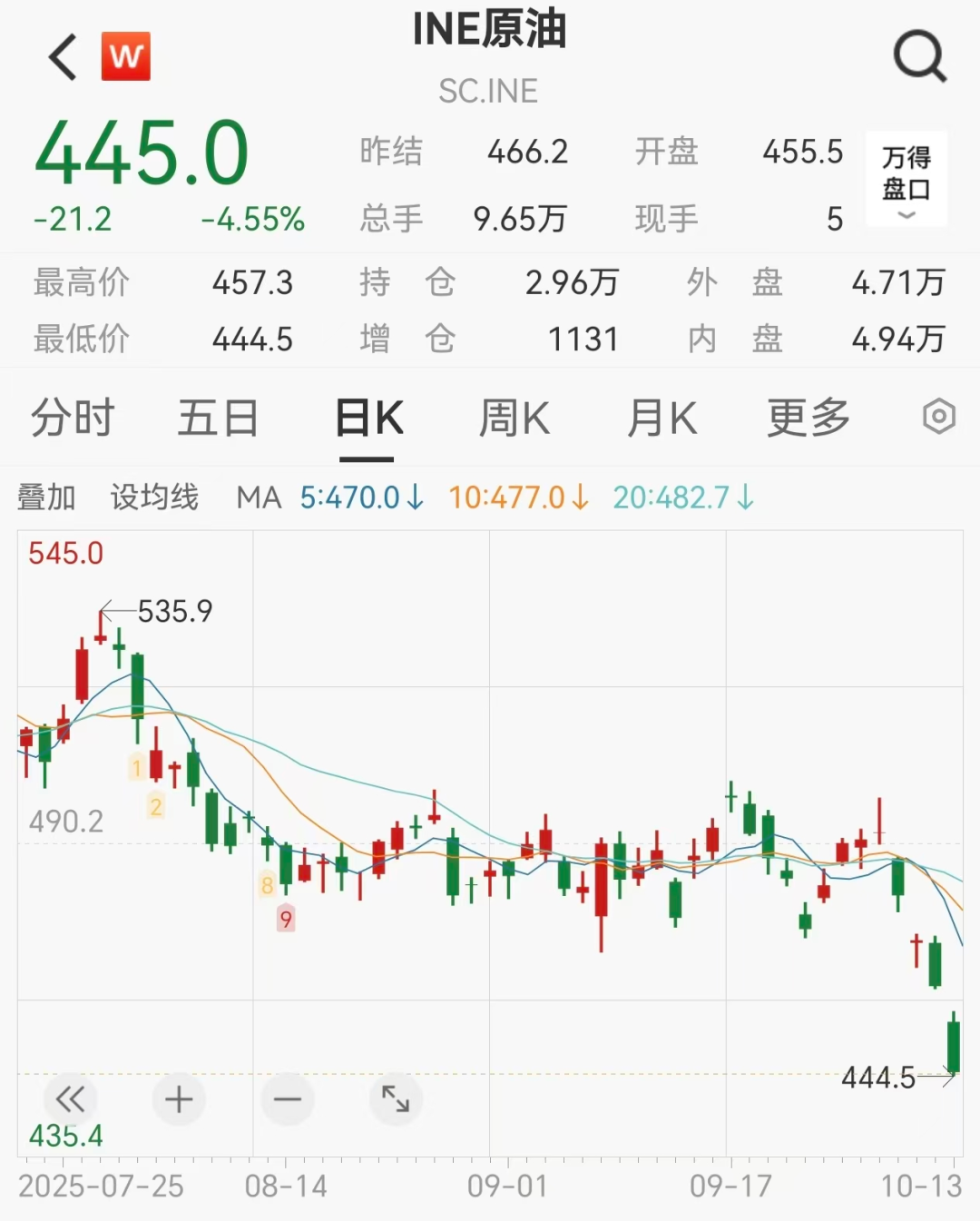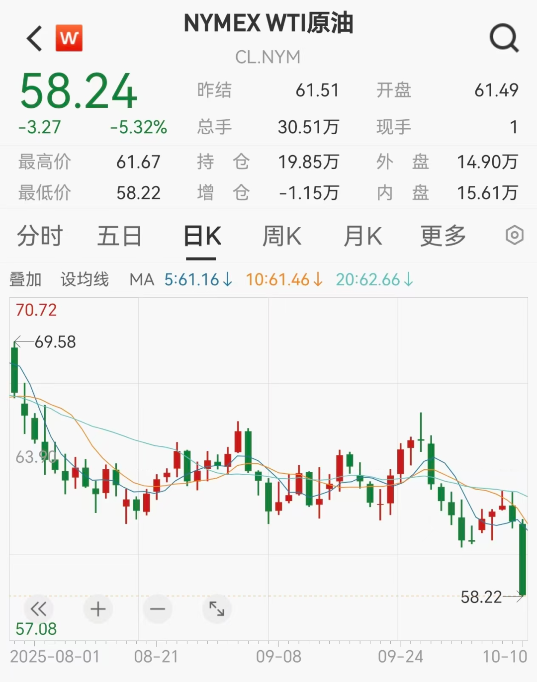 10月10日,WTI原油期货大跌5.32%,为5月以来低点;周五夜盘,国内原油期货主力合约2511跌幅为4.55%,同样逼近5月以来低点。