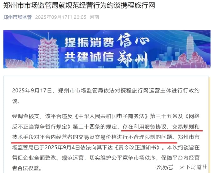 近期,携程被郑州市场监管局约谈,被指存在“利用服务协议、交易规则及技术手段,对平台内经营者的交易与价格施以不合理限制”的情况。早在9月4日该局已依法向携程下达《责令改正通知书》,近期又对其进行约谈,督促其全面整改、规范运营。