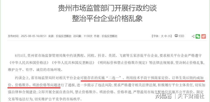 其实,这并非携程首次因价格问题被监管部门盯上。8月5日,贵州省市场监管局集中约谈时,明确指出携程等平台存在 “二选一”、技术干预商家定价、订单毁约加价等问题。
