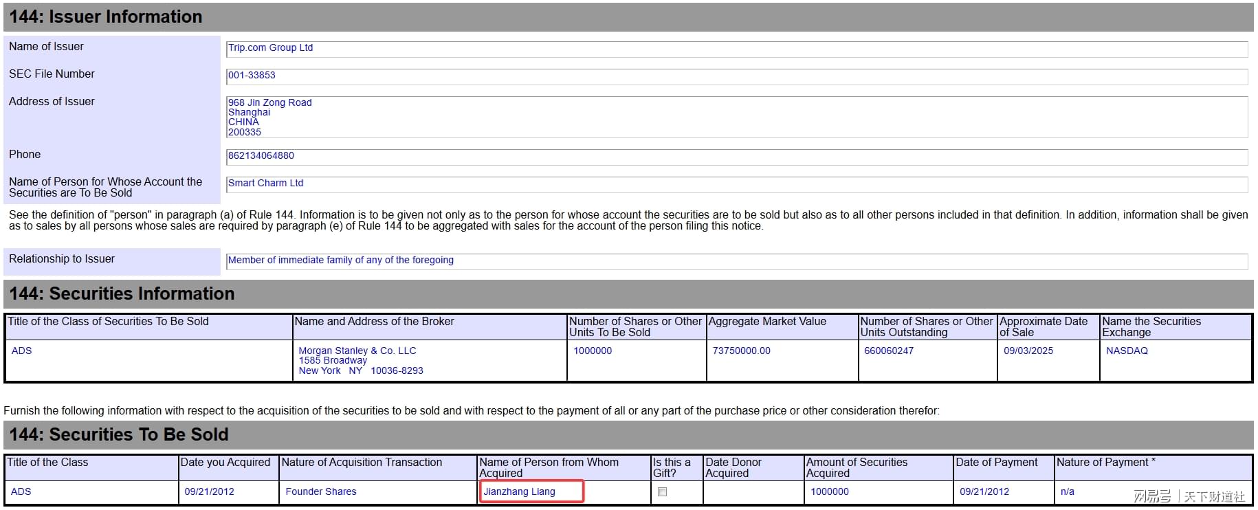 携程创始人、董事局主席梁建章2025年9月3日计划出售公司100万股ADS,价值7375万美元(约5.27亿元人民币)。