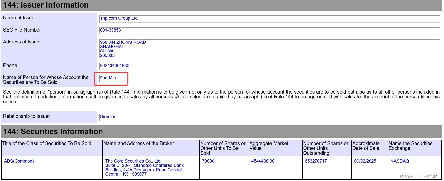 携程联合创始人、总裁范敏2025年9月2日计划出售7万股ADS,价值454万美元(约3242万元人民币)。