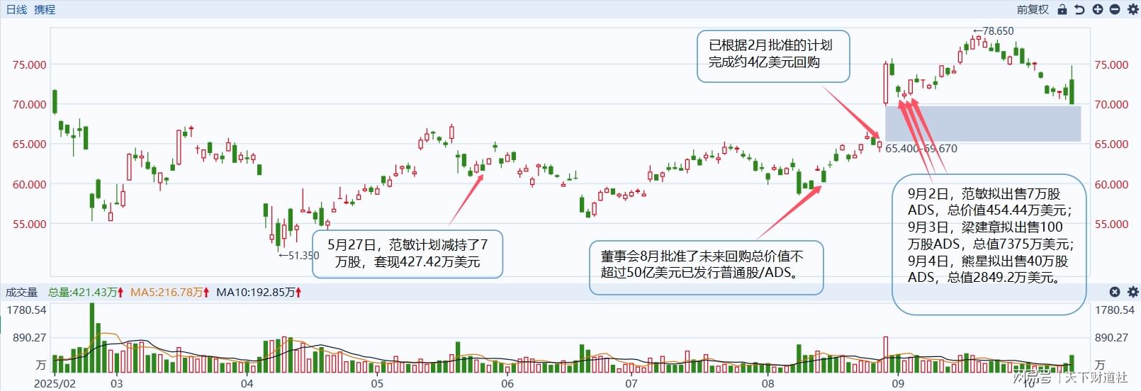 一方面,高管和大股东准备或已经在陆续减持,另一方面,半年报显示,携程集团董事会2025年8月批准了未来回购总价值不超过50亿美元已发行股票的新计划,此前已根据2025年2月批准的计划完成约4亿美元回购。