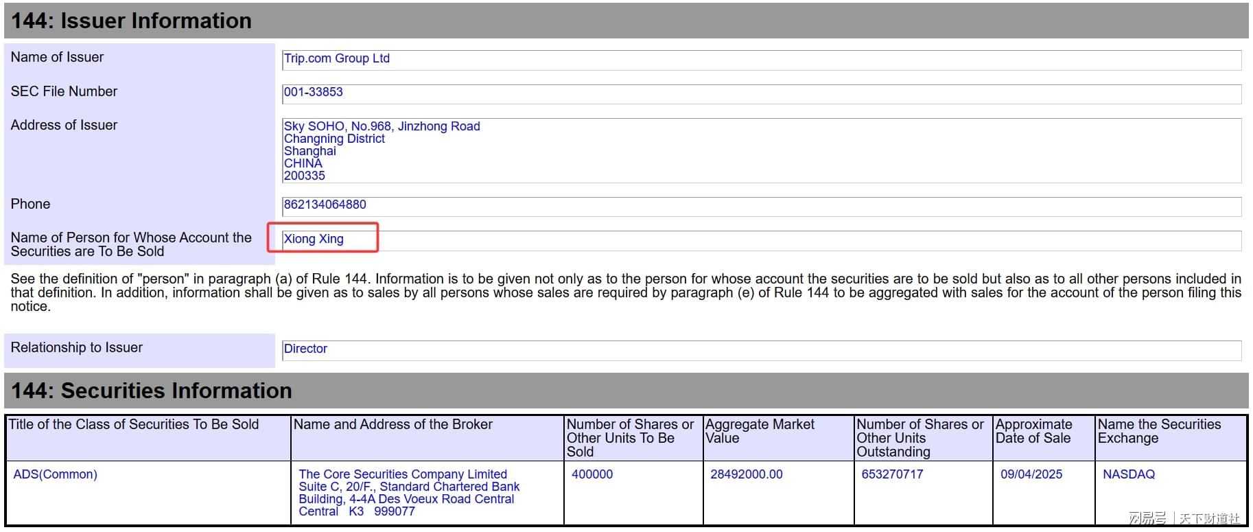 据携程递交给美国SEC的文件显示,携程董事、COO熊星在2025年9月4日减持40万股ADS,价值2849万美元(约2亿元人民币)。