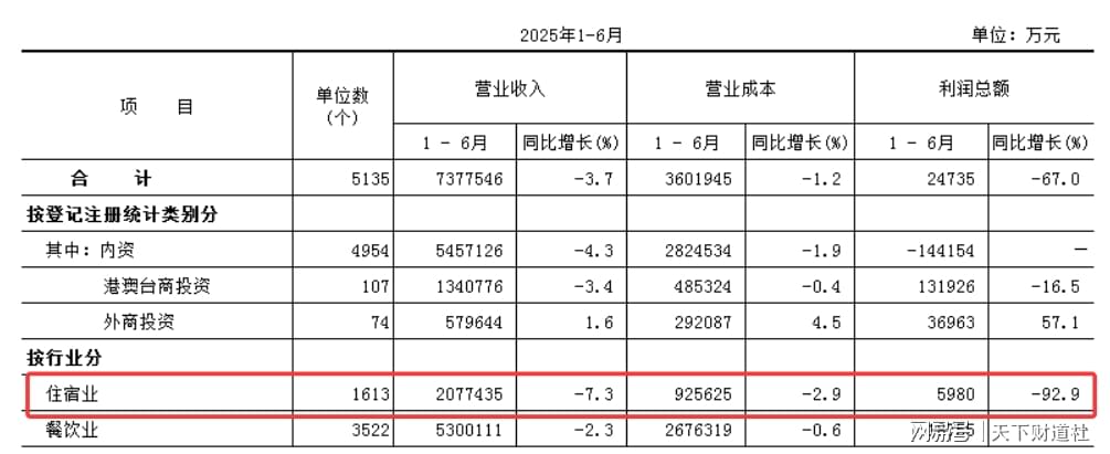 与之形成对比的是,2025年上半年,北京住宿业1613家单位利润总额仅5980万元,同比锐减约93%。