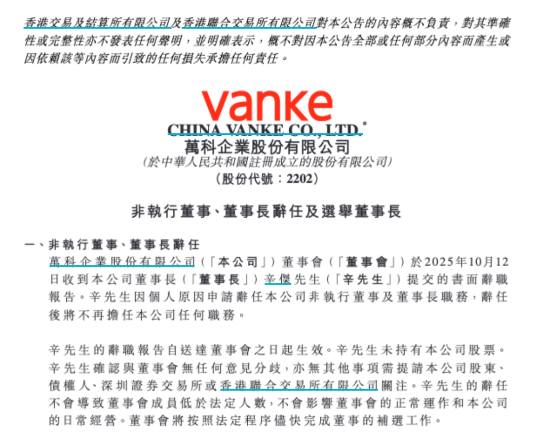 10月13日,万科企业(02202.HK)在港交所公告称,公司董事会于2025年10月12日收到公司董事长辛杰提交的书面辞职报告。辛杰因个人原因申请辞任公司非执行董事及董事长职务,辞任后将不再担任公司任何职务。辛杰的辞职报告自送达董事会之日起生效。辛杰未持有公司股票。辛杰确认与董事会无任何意见分歧,亦无其他事项需提请公司股东、债权人、深圳证券交易所或香港联合交易所有限公司关注。辛杰的辞任不会导致董事会成员低于法定人数,不会影响董事会的正常运作和公司的日常经营。董事会将按照法定程序尽快完成董事的补选工作。
