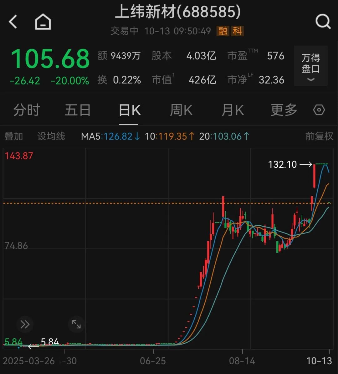 10月13日, 上纬新材复牌20%跌停,该股今年来涨势强劲,此前 年内最大涨幅超20倍 。