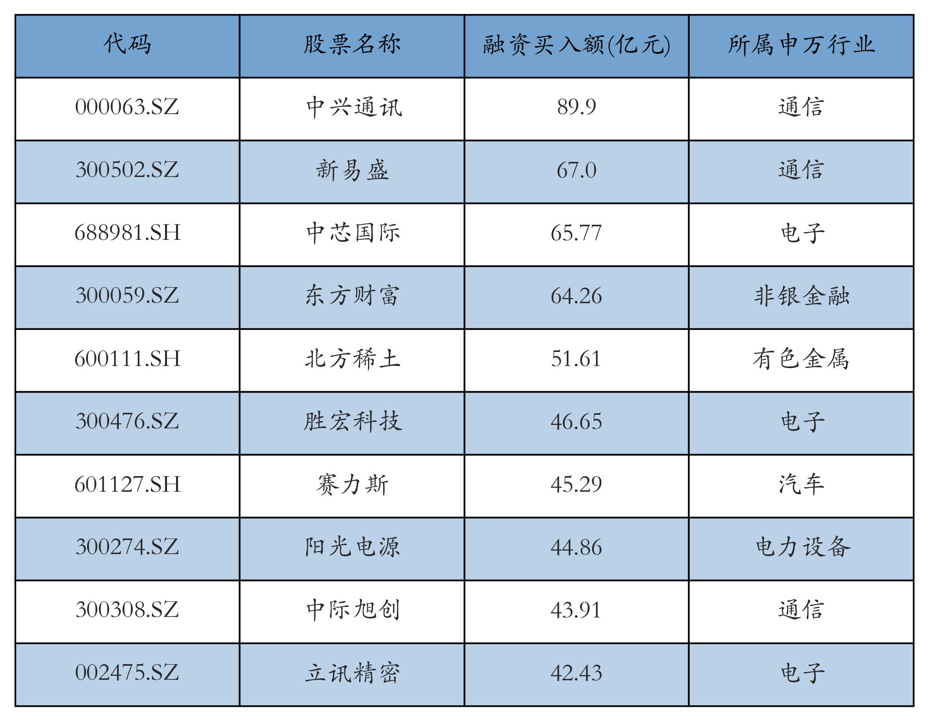 上周两市共有3442只个股有融资资金买入,共有89只个股买入金额超10亿元,其中中兴通讯、新易盛、中芯国际排名前三,买入金额分别89.9亿元、67.0亿元、65.77亿元。融资买入额前10个股详情见下表: