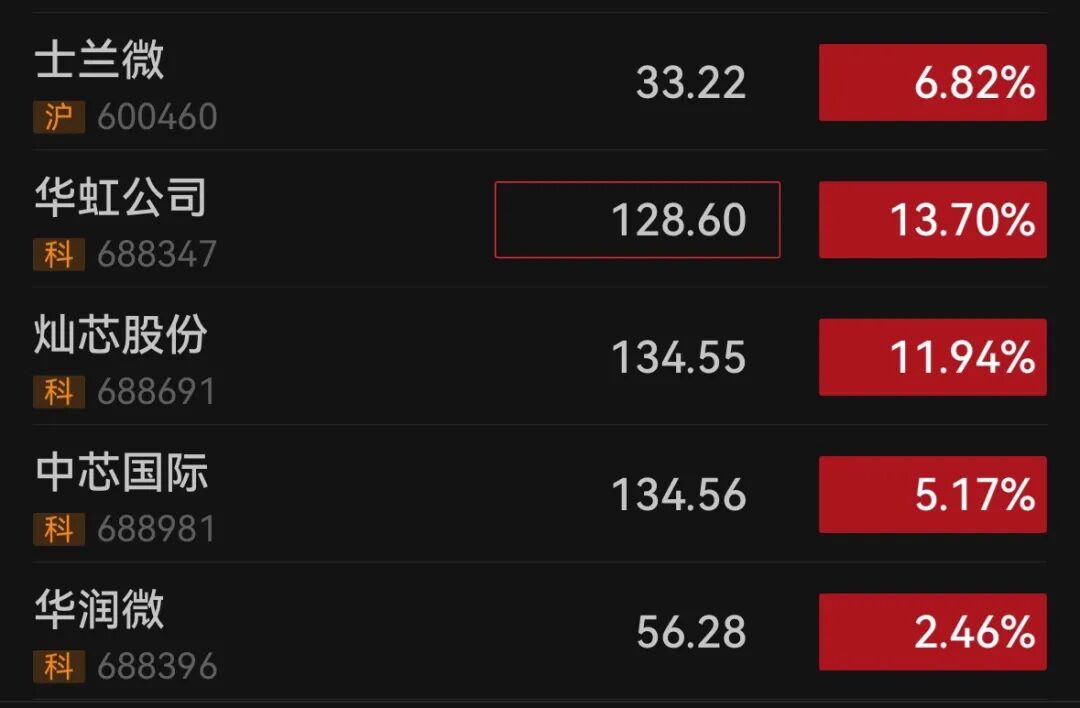 10月13日盘中,半导体产业链持续走强,晶圆代工、先进封装等方向拉升。华虹公司、灿芯股份涨超10%,士兰微涨近7%,中芯国际涨逾5%,华润微、新洁能、三安光电、富满微均走高。