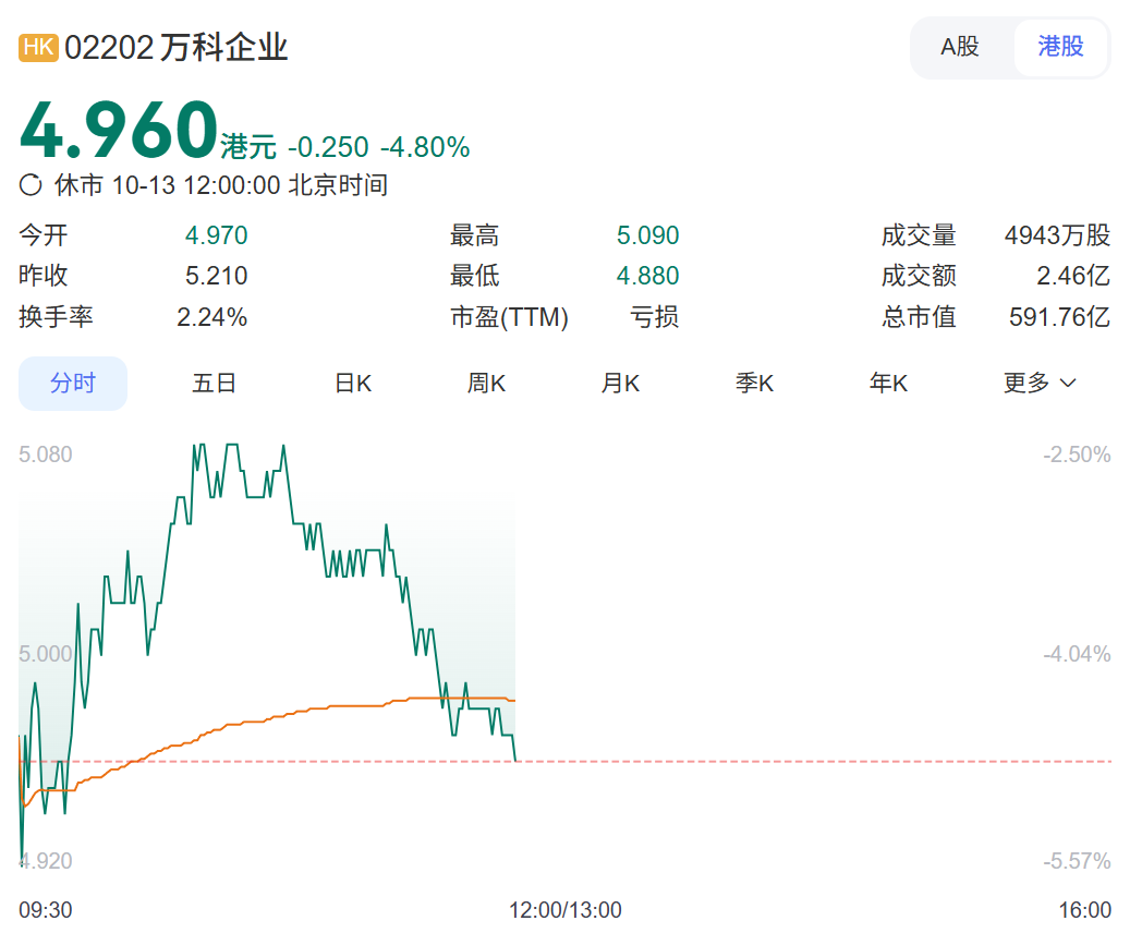 10月13日,万科股价在重大人事变动消息冲击下显著下跌。截至当日午间发稿,港股万科企业低开4.61%后一度跌超6%,最终报4.96港元/股,跌幅4.8%;A股万科A同步低开,跌幅达3.11%,报6.54元/股。
