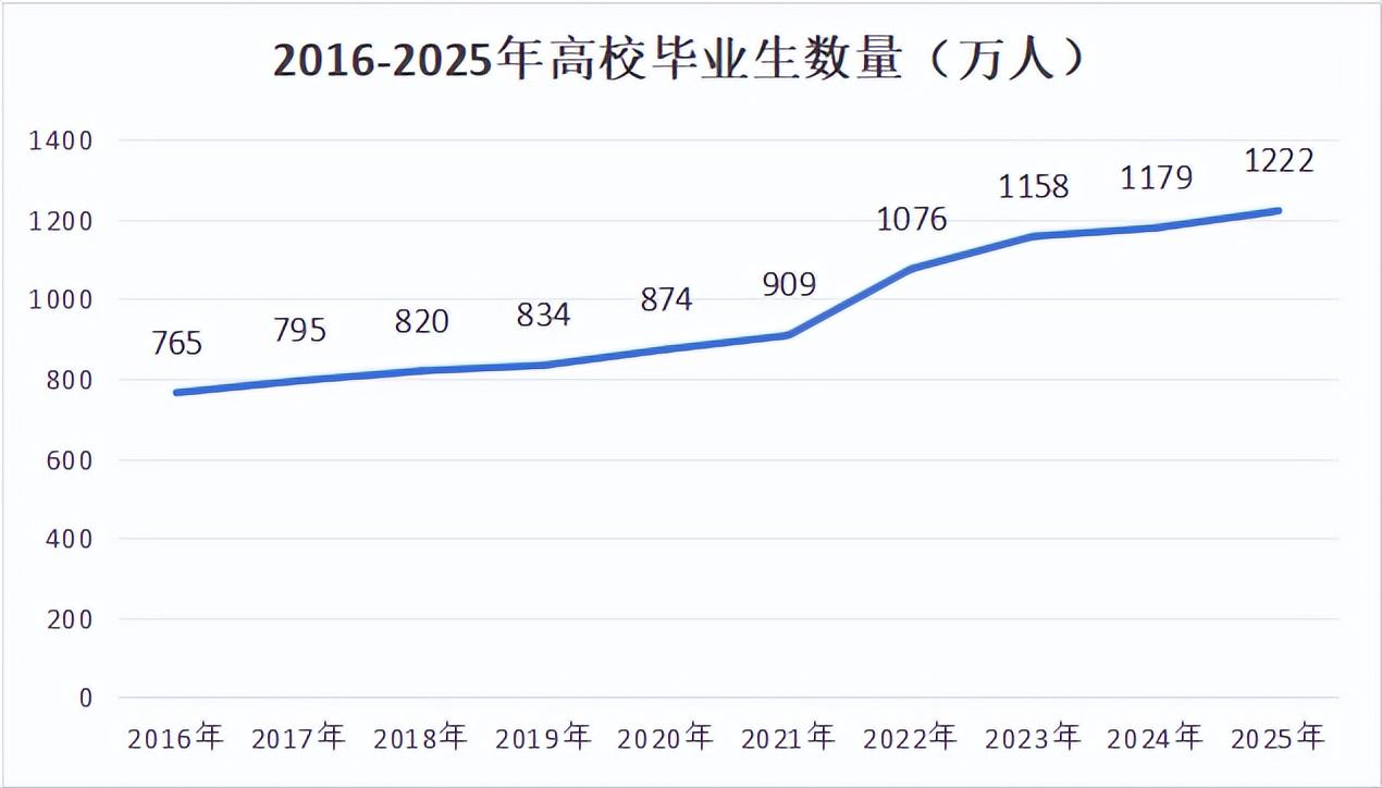 数据统计,在2000年,我国高校毕业生是95万,10年后的2010年达到575.4万,到2020年是874万,2025年1222万。