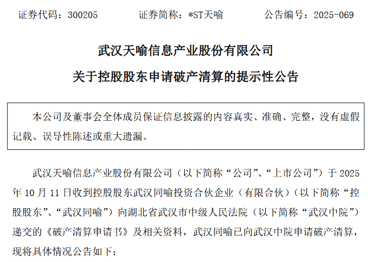 中新经纬10月13日电 武汉天喻信息产业股份有限公司(下称“*ST天喻”)10月13日发布公告称,公司于10月11日收到控股股东武汉同喻投资合伙企业(有限合伙)(下称“武汉同喻”)向武汉中院递交的《破产清算申请书》及相关资料,武汉同喻已向武汉中院申请破产清算。