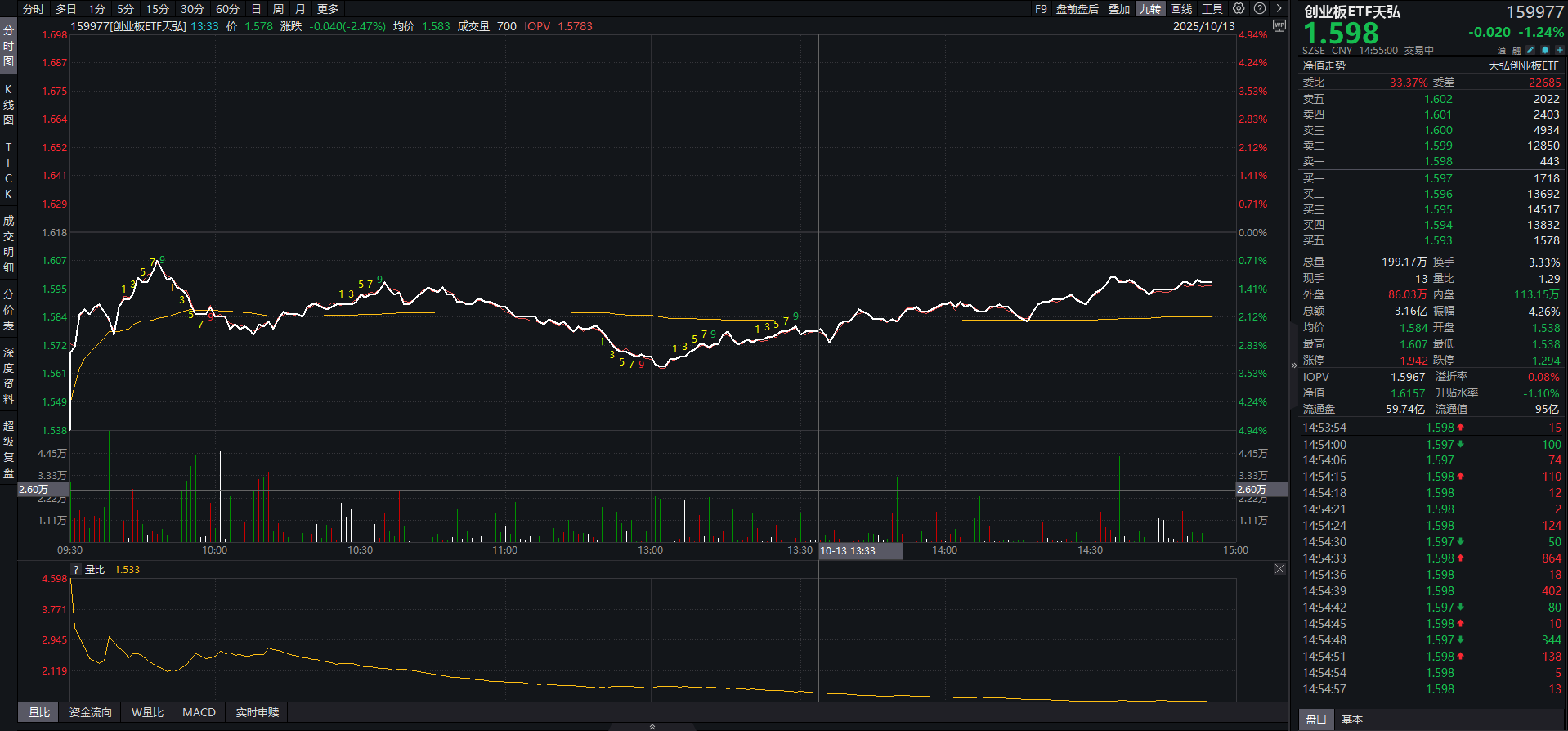 10月13日,创业板在早盘低开后震荡回升,稀土永磁、锂电产业链活跃不断。相关ETF中,临近尾盘收盘,创业板ETF天弘(159977)跌幅收窄至1.24%,较日内最低点反弹回升超3%,振幅超4%。