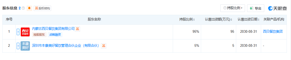 股东信息显示,玉华美好由内蒙古西贝餐饮集团有限公司(以下简称“西贝”)出资95万元,持股95%;深圳市本康美好餐饮管理合伙企业(有限合伙)出资5万元,持股5%。