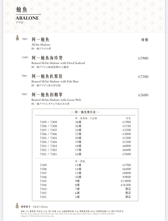 香港总店的鲍鱼,个头比较小的都要1900港元一只,个头大的要一万多港元,最大的甚至不标价,只接受预定。