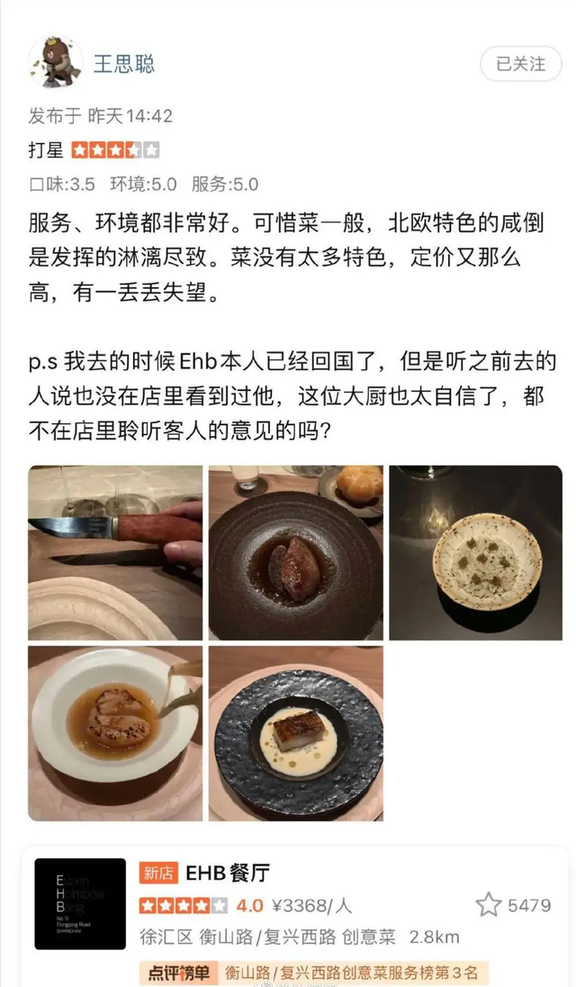 别看条件苛刻,王思聪都来这家店打过卡,菜品全是“大盘子小份量”的米其林餐。不过,他来的时候,EHB本人不在,但是他的大徒弟、驻店主厨Viviane Mello也是个厉害的人,在开业半年后,就拿下了年轻厨师奖,EHB餐厅也评上了上海米其林的一星。