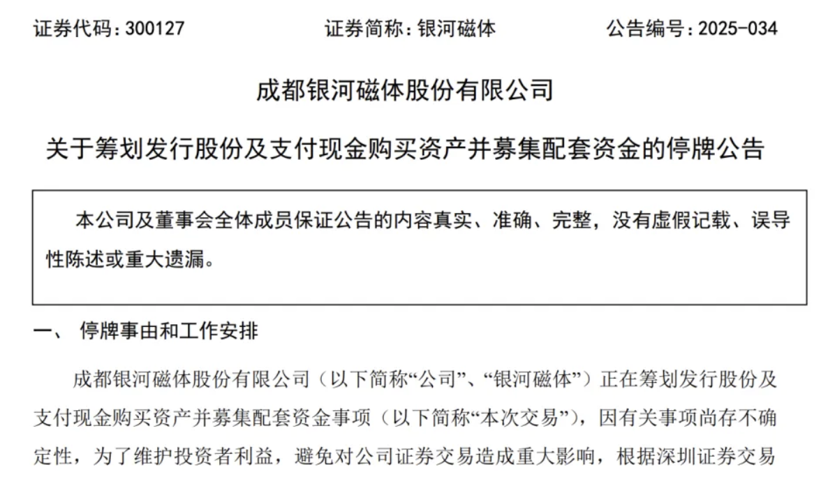 微成都注意到,停牌10个交易日后,银河磁体的资本运作计划揭开面纱。