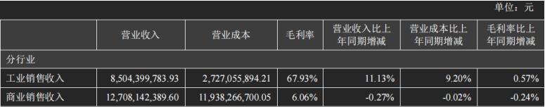 财报显示,2025年上半年,公司商业销售收入约127亿元,占营业收入比重为59.78%,是公司的主要收入来源;工业销售收入85.04亿元,占营业收入比重40.01%。