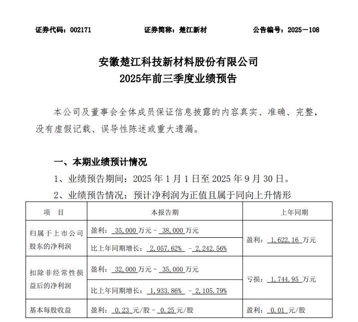 数据显示,楚江新材预计前三季度实现归属于上市公司股东的净利润3.50亿元~3.80亿元,同比增加2057.62%~2242.56%;预计扣除非经常性损益后的净利润3.20亿元~3.50亿元,同比增加1933.86%~2105.79%。