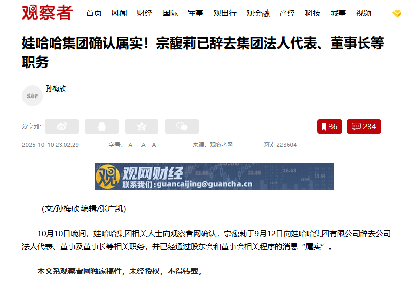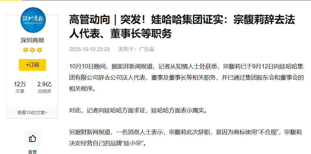 10月10日,多家媒体报道称,宗馥莉辞去了娃哈哈集团法人代表、董事及董事长等职务。