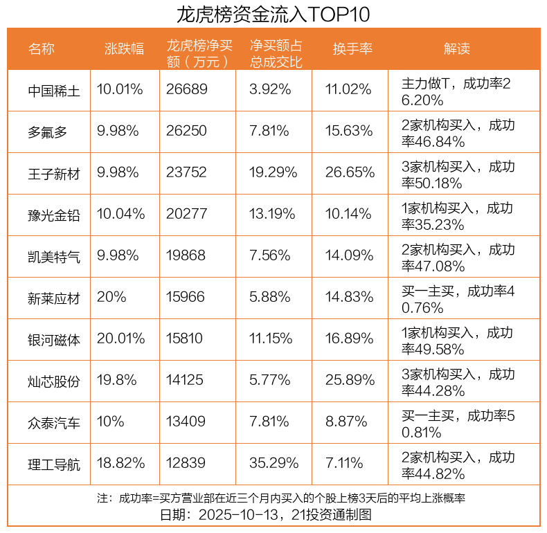 10月13日,上证指数下跌0.19%,深证成指下跌0.93%,创业板指下跌1.11%。盘后龙虎榜数据显示,共有59只个股因当日异动登上龙虎榜,资金净流入最多的是中国稀土(000831.SZ),达2.67亿元。