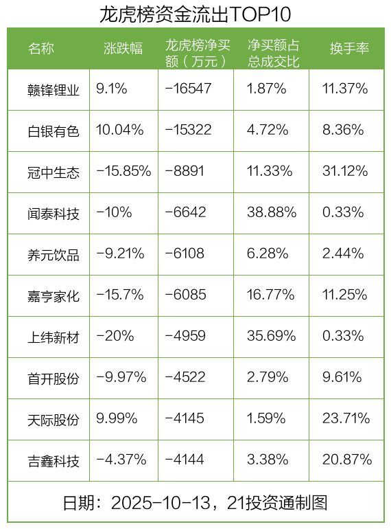 而龙虎榜中资金净流出最多的是赣锋锂业(002460.SZ),被净卖出为1.65亿元,占总成交金额的1.87%。赣锋锂业收盘上涨9.1%,换手率为11.37%。