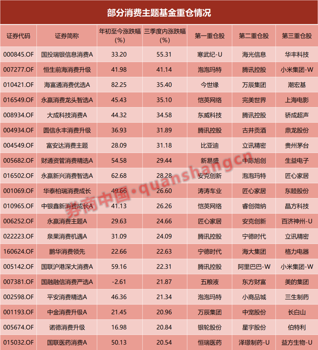 年内,首先,名称中含有“消费”字眼的主动权益基金中,海富通消费优选业绩实现领跑,涨幅高达82.25%,其次,永赢新兴消费智选、国联沪港深大消费以及财通资管消费精选等三只产品涨超55%。然而也有鑫元消费甄选、长信消费精选行业量化等基金业绩告负。
