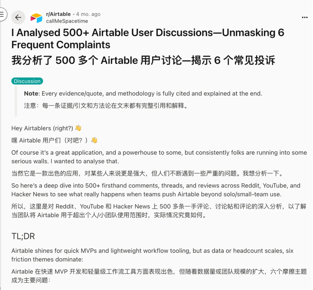 然而,在Reddit等社区中,大量Airtable的长期“超级用户”表达了截然不同的看法。他们的批评主要集中在以下几个方面: