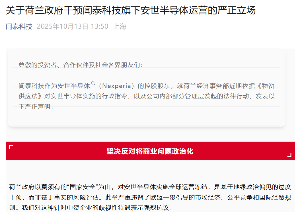 除了交易所公告,闻泰科技还在10月12日晚发表强硬声明,指责荷兰政府以“国家安全”为名实施政治性干预,称个别外籍高管配合外部势力试图“颠覆公司合法治理结构”。