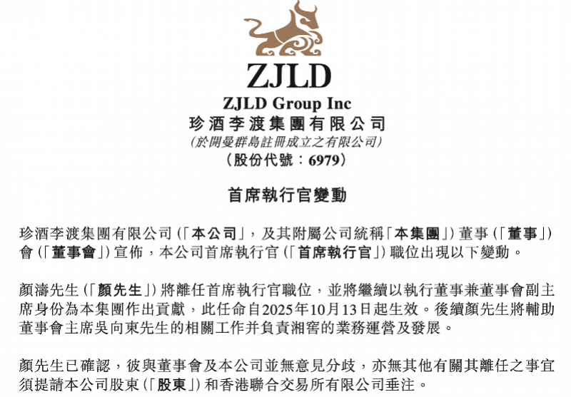 珍酒李渡CEO发生调整。(截图来源:公司公告)
